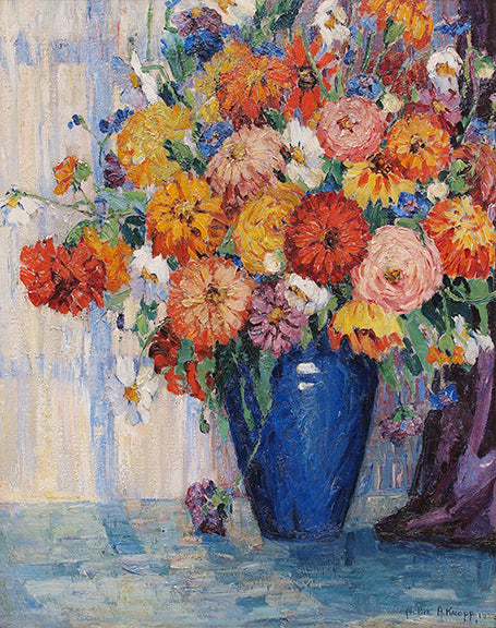 Born in Chicago, Nellie Knopf attended the Art Institute of Chicago where she studied under John Vanderpoel and Frederick Free. She graduated in 1900 with honors. The same year, she took a teaching position at Illinois State Woman's College (later MacMurray College). She remained at the college for 43 years, eventually becoming the director of the art department. Only five feet tall and hard of hearing, she was a determined artist who never let her deafness interfere with her painting or teaching career.
