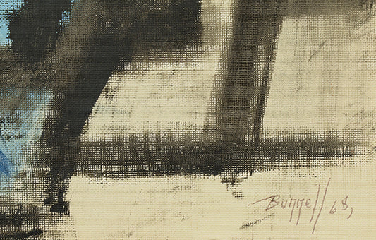 The geometric shapes of his earlier representational work reappeared in the 1950s in the form of roughly- rendered rectangles, squares and triangles in various sizes and colors in his pure abstractions, such as an untitled composition (1951) of small, massed geometric shapes in an impasto surface highlighted in bright red, blue and green. By mid-decade his palette became a little more subdued with larger shapes dominating the canvas, as in Artist and His Pictures (1955), and Progression (1956) with its superimposed clusters of smaller geometric shapes. These and other similar abstract paintings constitute the highlight of his career during which, in the words of Al Kochka -- curator of Bunnell's posthumous retrospective (1987) at the Amarillo Art Center - "he never ceased to experiment and expand his visual language."