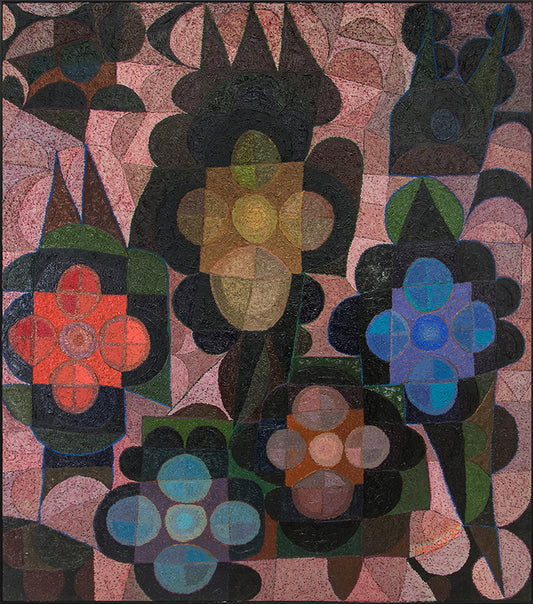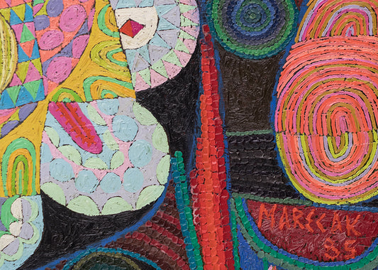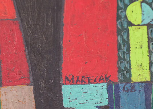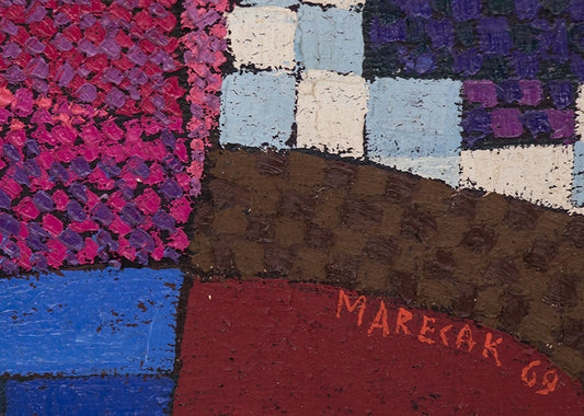 Prior to coming to Colorado, Marecak did watercolors resembling those of Winslow Homer, John Singer Sargent and Charles Burchfield. However, once in Colorado Springs he decided to destroy much of his earlier ouevre, embarking on a totally new direction unlike anything he had previously done. Initially, in the 1940s he was influenced by surrealist imagery and Paul Klee, and in the West by Indian petroglyphs and Kachinas. His first one-person show at the Garrett Gallery in Colorado Springs in 1949 featured paintings and lithographs rendered in the style of Surrealism, Magic Realism & Fantasy and referential abstraction. The pieces, including an oil Witch with Pink Dish, foreshadowed the output of his entire Colorado-based career, distinguished by a dramatic use of color, intricacy of execution and attention to detail contributing to their visual impact. He once observed, "Each time I start a new painting I always fool myself by saying this time keep it simple and not get entangled with such complex patterns, color and design; but I always find myself getting more involved with richness, color and subject matter."
