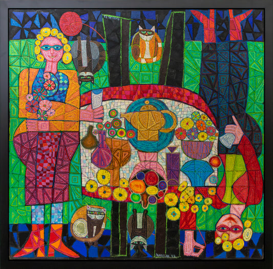 Marecak's love of classical music and opera, which he shared with his wife and to which he often listened while painting in his Denver basement studio, is reflected in Homage of Offenbach, an abstract work translating the composer's musical colors into colorful palette. Pace, Pace, Mio Dio, the title of his earliest surrealist painting, is a soprano aria from Verdi's opera, La Forza del Destino (The Force of Destiny or Fate, a favorite Marecak subject). His Queen of the Night relates to a character from Mozart's opera, The Magic Flute.