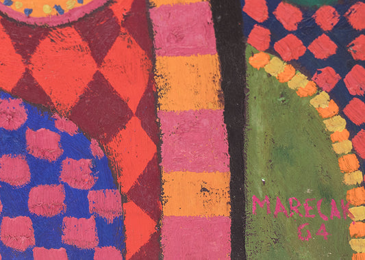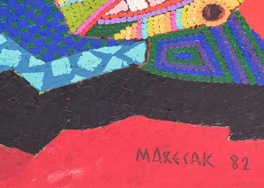 Prior to coming to Colorado, Marecak did watercolors resembling those of Winslow Homer, John Singer Sargent and Charles Burchfield. However, once in Colorado Springs he decided to destroy much of his earlier ouevre, embarking on a totally new direction unlike anything he had previously done. Initially, in the 1940s he was influenced by surrealist imagery and Paul Klee, and in the West by Indian petroglyphs and Kachinas. His first one-person show at the Garrett Gallery in Colorado Springs in 1949 featured paintings and lithographs rendered in the style of Surrealism, Magic Realism & Fantasy and referential abstraction. The pieces, including an oil Witch with Pink Dish, foreshadowed the output of his entire Colorado-based career, distinguished by a dramatic use of color, intricacy of execution and attention to detail contributing to their visual impact. He once observed, "Each time I start a new painting I always fool myself by saying this time keep it simple and not get entangled with such complex patterns, color and design; but I always find myself getting more involved with richness, color and subject matter."