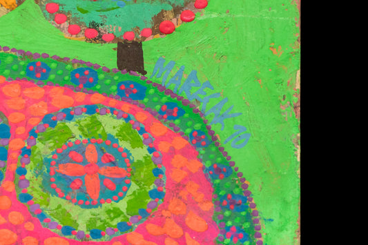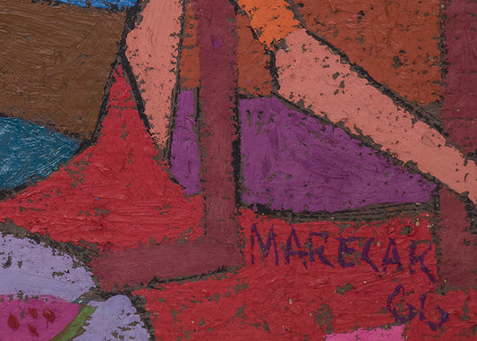 Prior to coming to Colorado, Marecak did watercolors resembling those of Winslow Homer, John Singer Sargent and Charles Burchfield. However, once in Colorado Springs he decided to destroy much of his earlier ouevre, embarking on a totally new direction unlike anything he had previously done. Initially, in the 1940s he was influenced by surrealist imagery and Paul Klee, and in the West by Indian petroglyphs and Kachinas. His first one-person show at the Garrett Gallery in Colorado Springs in 1949 featured paintings and lithographs rendered in the style of Surrealism, Magic Realism & Fantasy and referential abstraction. The pieces, including an oil Witch with Pink Dish, foreshadowed the output of his entire Colorado-based career, distinguished by a dramatic use of color, intricacy of execution and attention to detail contributing to their visual impact. He once observed, "Each time I start a new painting I always fool myself by saying this time keep it simple and not get entangled with such complex patterns, color and design; but I always find myself getting more involved with richness, color and subject matter."