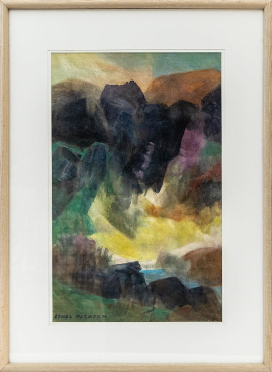 Ethel did many sketches and drawings of places she found which had special meaning for her. They enabled her to recall their vital qualities which she later painted in her Woodstock studio, conveying her feeling about places remembered. She also produced a number of watercolors and prints of the Colorado landscape that constituted a departure from the American Scene style of her earlier paintings. Her postwar creative output collectively belongs to the category of landscape abstractionists as described by author Sheldon Cheney, although to a greater or lesser degree her work references Colorado's mountainous terrain. She introduced a palette of stronger pastels in her paintings such as two temperas, Evening Mountains from the 1950s and Springtime in the Mountains from the early 1960s.
