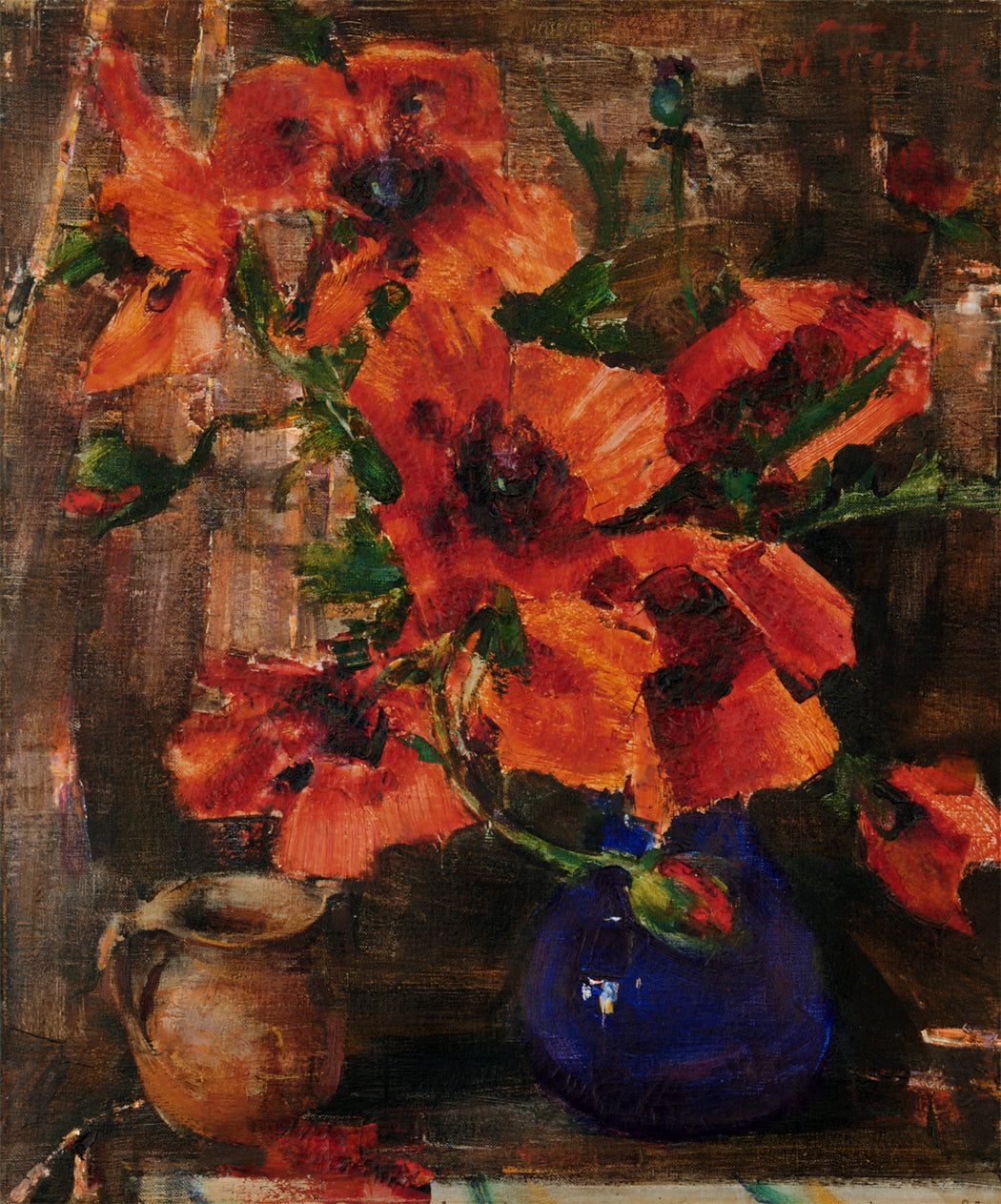Seeking the drier climes of Taos, New Mexico, the Fechins first rented an apartment from Mabel Dodge Luhan, but Alexandra did not care for their colorful landlady. The artist bought a nearby adobe home. Rather than socialize with the artists community there, Fechin devoted himself to making Russian carvings and designs for the structure (The house is now the Taos Art Center and Fechin Museum.) Living in Taos for six years, the artist painted ordinary people of the area, including children, with his Sargent-like style of portraiture. Responding to their simplicity, he endowed his figures and his still-life works with splendor.