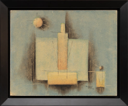 The geometric shapes of his earlier representational work reappeared in the 1950s in the form of roughly- rendered rectangles, squares and triangles in various sizes and colors in his pure abstractions, such as an untitled composition (1951) of small, massed geometric shapes in an impasto surface highlighted in bright red, blue and green. By mid-decade his palette became a little more subdued with larger shapes dominating the canvas, as in Artist and His Pictures (1955), and Progression (1956) with its superimposed clusters of smaller geometric shapes. These and other similar abstract paintings constitute the highlight of his career during which, in the words of Al Kochka -- curator of Bunnell's posthumous retrospective (1987) at the Amarillo Art Center - "he never ceased to experiment and expand his visual language."