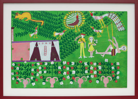 Saldana only painted for fifteen years, working entirely by memory and imagination. His work is of whimsical memories from his childhood in San Luis Potosi, Mexico, portraying ranch life, landscapes, his great love of animals and especially his wonderful flower garden. Saldana painted every day, completing a new piece about every three days and although he painted for a short amount of time, he amassed an impressive body of work.