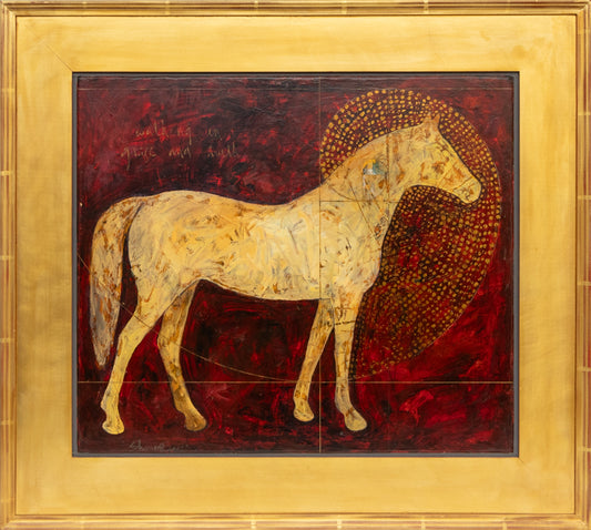 Walking in Grace and Truth (Gold horse standing against a red background), Painting, 2001