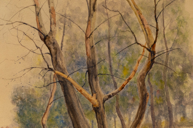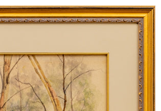 Early vintage 1880s landscape painting of trees in Spring near Denver, Colorado by Alexis Comparet. Watercolor on paper. Signed by the artist and dated, 1888, lower left. Presented in a custom frame gold tone frame with archival materials and UV protectant glass.