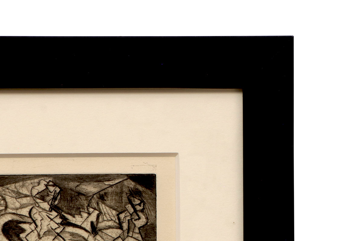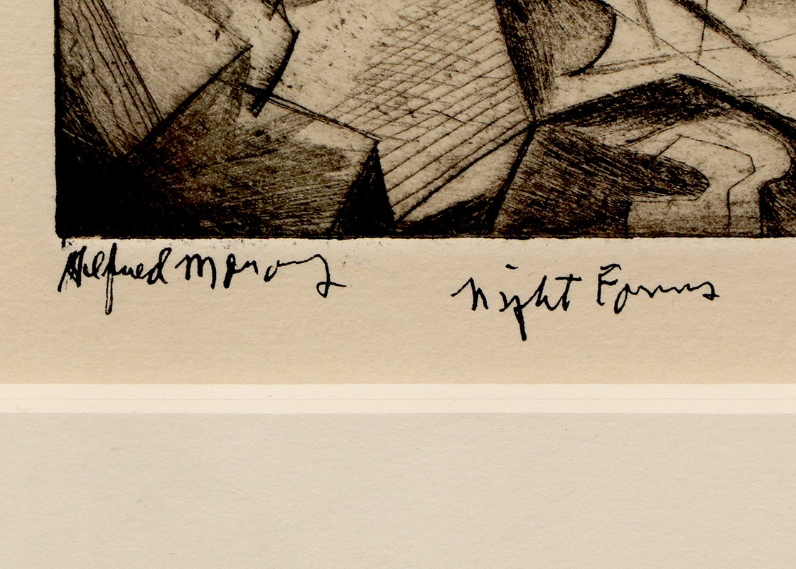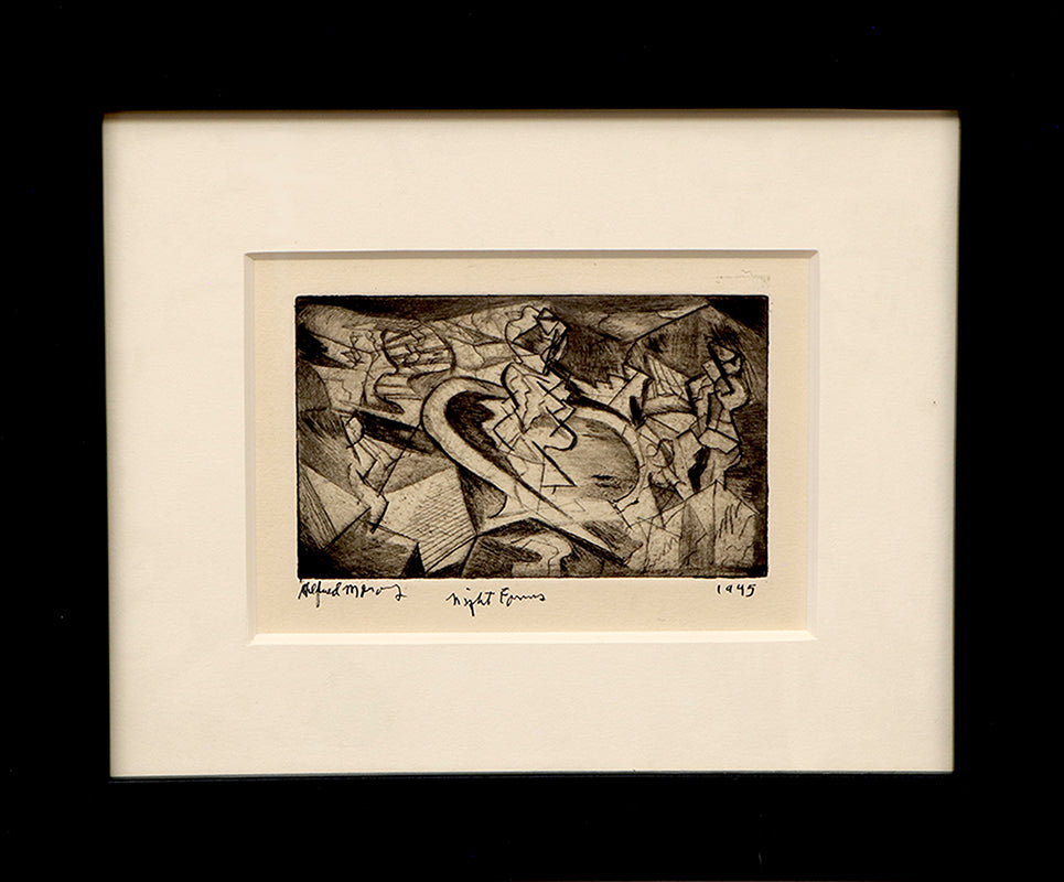 "Night forms", original vintage fine art print by artist Alfred Gwyne Morang. Modernist in style, the composition depicts an abstracted black and white landscape. Lithograph on paper. Signed by the artist, lower left; Titled lower center; Dated, 1945, lower right. Presented in a custom frame.