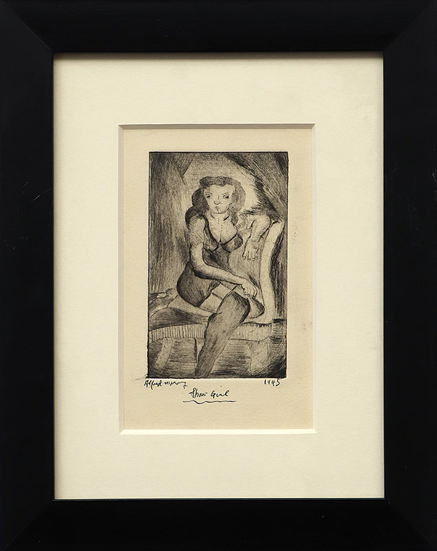 "Show Girl", original vintage fine art print by artist Alfred Gwynne Morang. Modernist in style, the black and white composition depicts a show girl, posed and facing the viewer. Lithograph on paper. Signed by the artist, lower left; Titled lower center; Dated, 1945, lower right. Presented in a custom frame.
