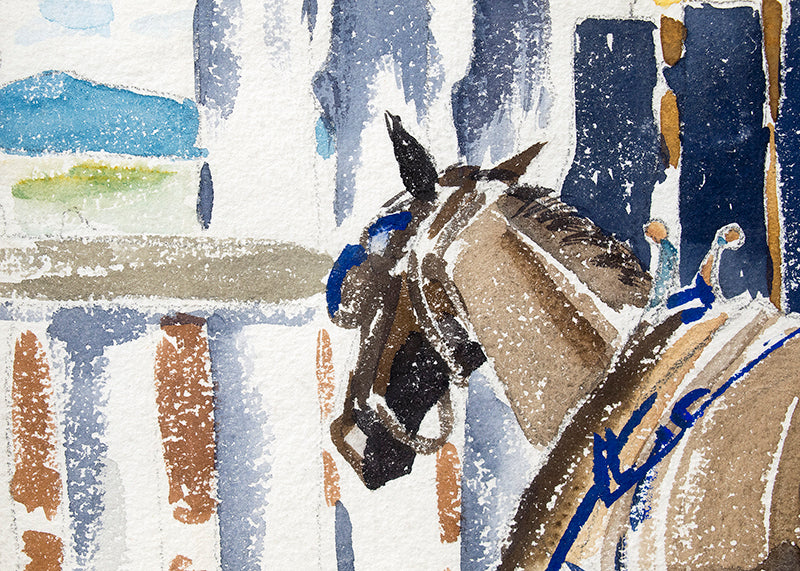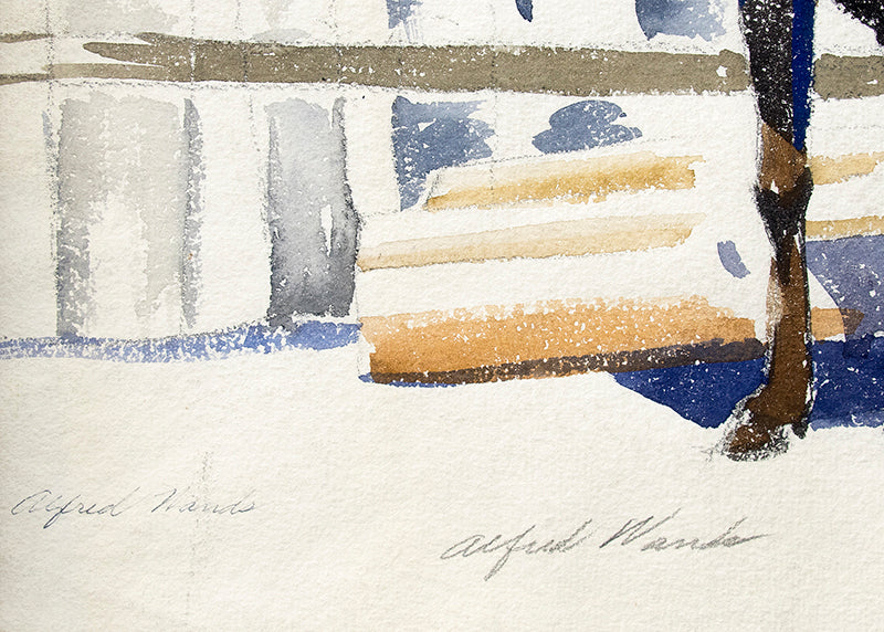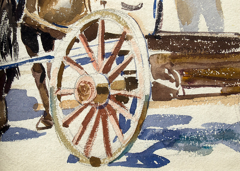 Original vintage painting by artist Alfred James Wands (1904-1998). The composition depicts two horses harnessed to a small cart. Watercolor on paper. Signed by the artist, lower left. Presented in a custom frame.