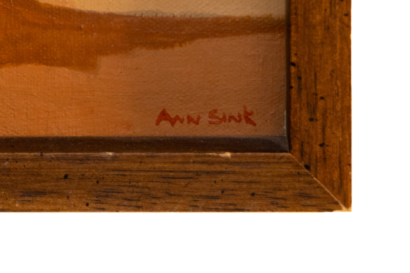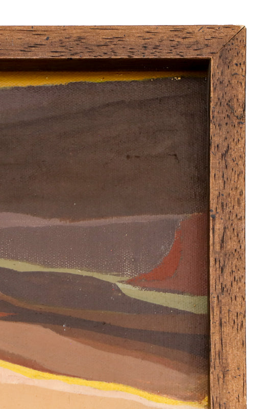 "Desert Landscape," original 1960 referential abstract painting by New Mexico and Colorado artist, Ann Sink. Composition set in earth tones of brown, taupe, tan, mustard, and terracotta. Acrylic on canvas. Signed by the artist, lower right. Presented in a custom hardwood frame.
