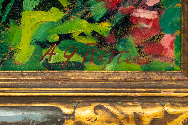 No. 2 White and Pink Phlox, original vintage circa 1920 painting by artist Anne Lawrence Gregory Ritter. The composition depicts a vibrant field of pink and white phlox flowers. Oil on artist board. Signed by the artist, lower right; Titled on reverse. Presented in a custom vintage frame.