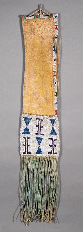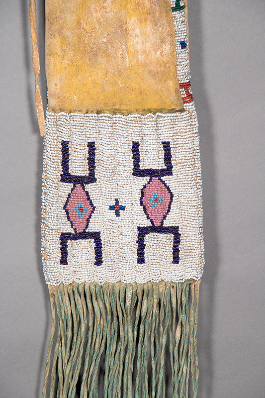 An exceptional tobacco/pipe bag from the late Classic period (pre or early reservation era). Constructed of native tanned hide and expertly beaded with trade beads. The fringe has been rubbed in blue ochre and the upper body of the bag in yellow ochre.