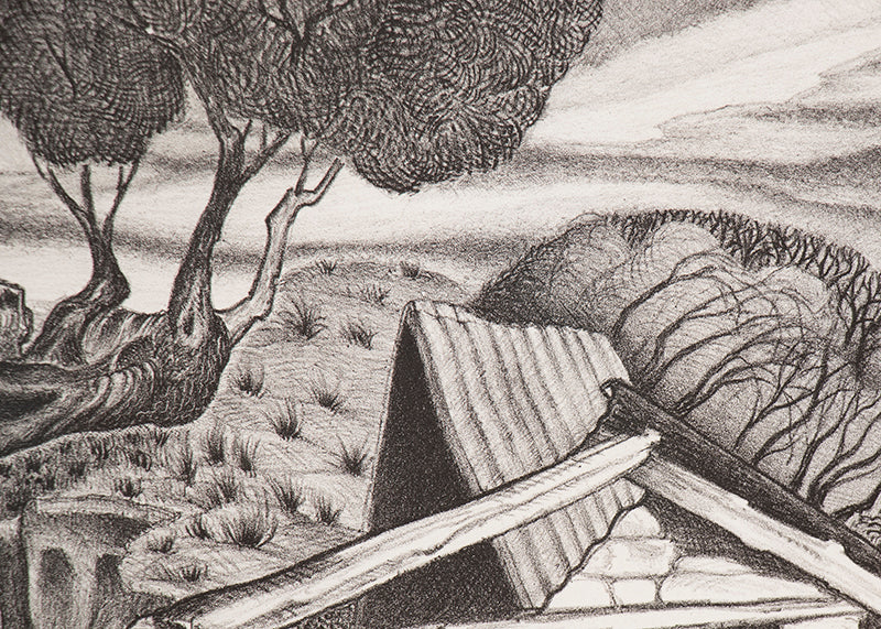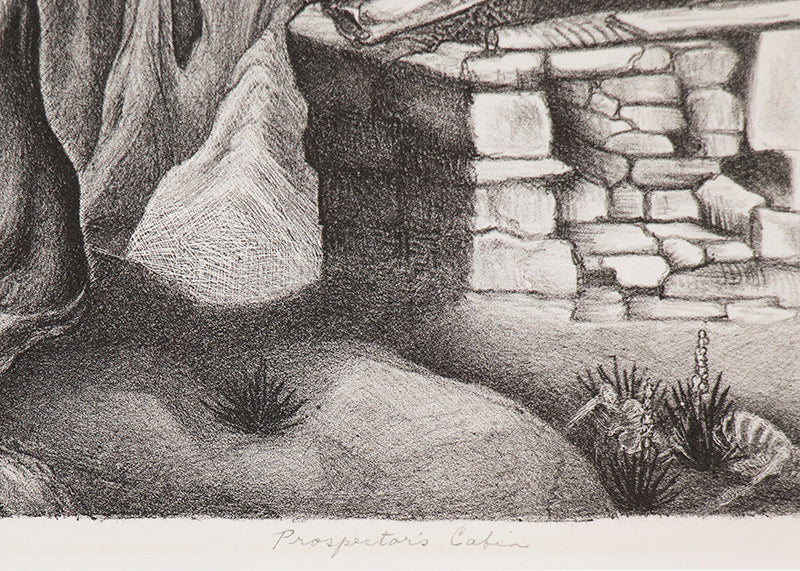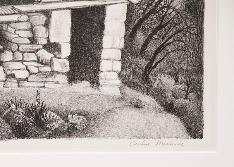 Prospector's Cabin, original vintage circa 1937 fine art print by Colorado artist Archie Musick. Composition featuring an abandoned prospector's cabin surrounded by trees and mountains. A skeleton lies in the foreground, half hidden by overgrown grasses. Lithograph on paper. Signed by the artist, lower right margin; Titled center margin. Presented in a custom frame.
