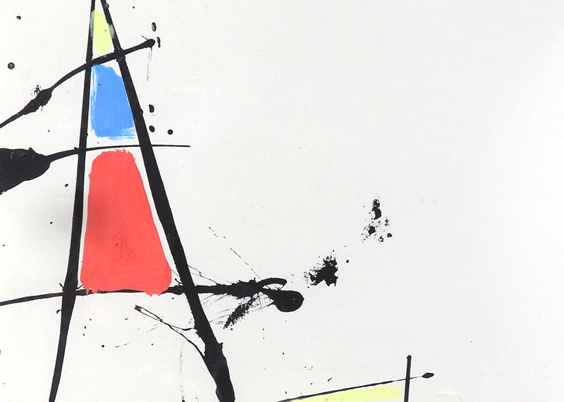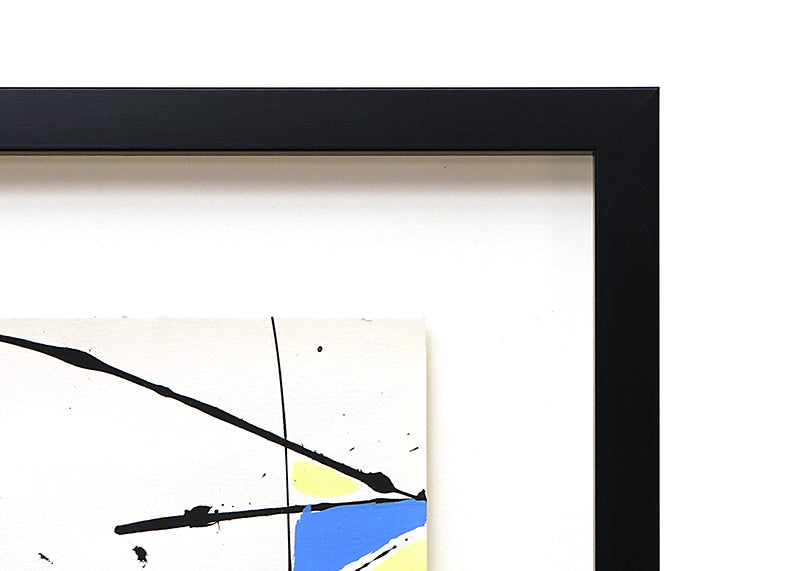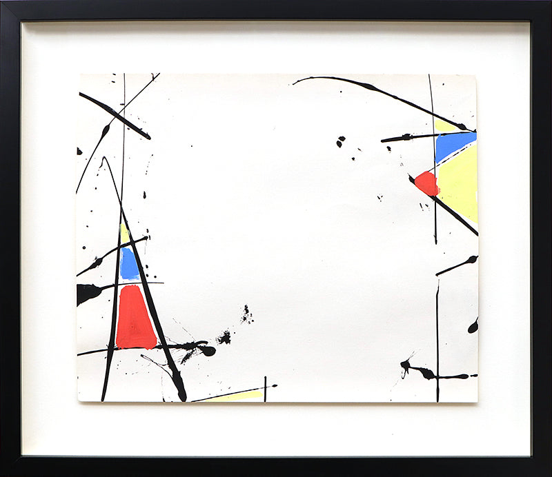 Original circa 1970s abstract painting by Taos, New Mexico artist Beatrice Mandelman. Minimalist composition in primary colors of red, blue, yellow, and black on a white field. Acrylic on paper. Presented in a custom frame with UV70 protectant glass.