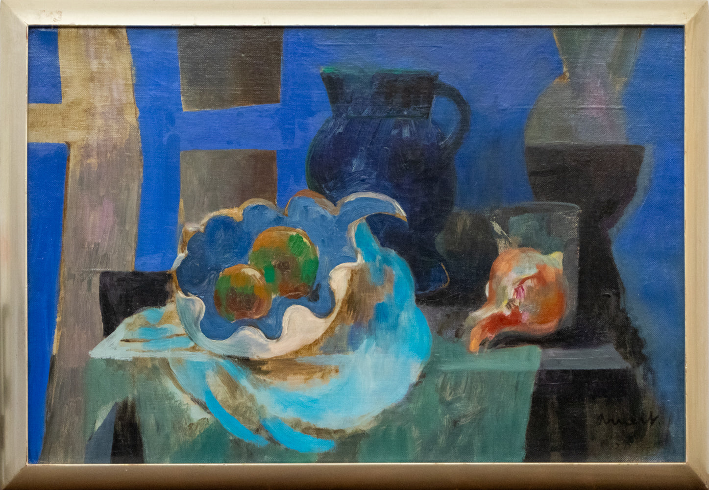 Original still life painting by artist Bernard Arnest. The composition depicts a semi-abstract still life of a fruit bowl, a vase, and a pitcher sitting together on a table. Oil on canvas. Signed by the artist, lower right; Dated 1957. Presented in a custom frame.