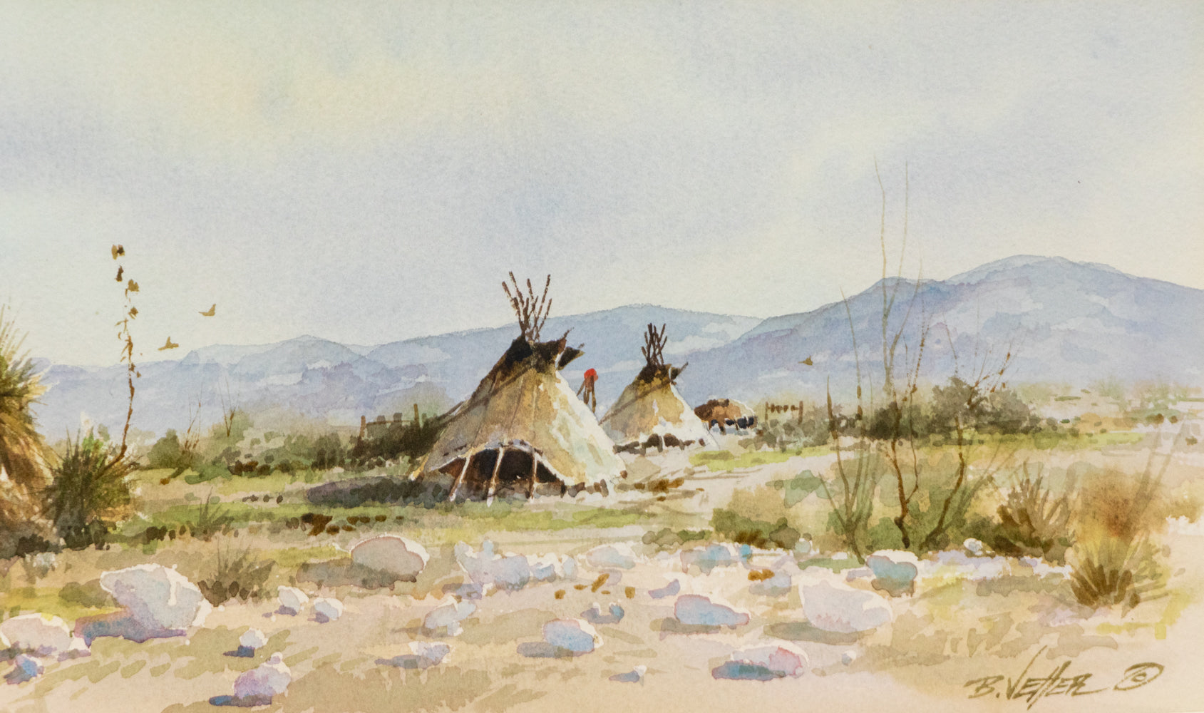 Desert Encampment, original landscape painting by artist Bernard Vetter. Southwestern landscape depicting a small encampment of teepees surrounded by desert grasses and yucca cacti. Watercolor on paper. Signed by the artist, lower right; Signed and titled on reverse. Presented in a custom frame.