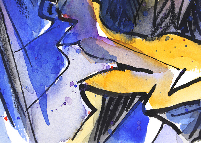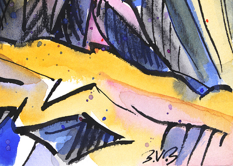 Walpi #1, original mixed media painting by artist Bert Van Bork. Abstracted landscape of a Hopi village atop a mesa in shades of blue, yellow, and pink. Watercolor, ink, and charcoal on paper. Signed by the artist, lower right; Signed, titled, and dated, 2001, on reverse. Presented in an archival mat. Custom framing options available.
