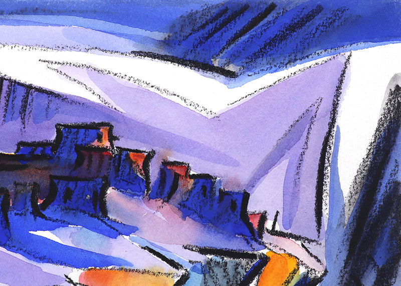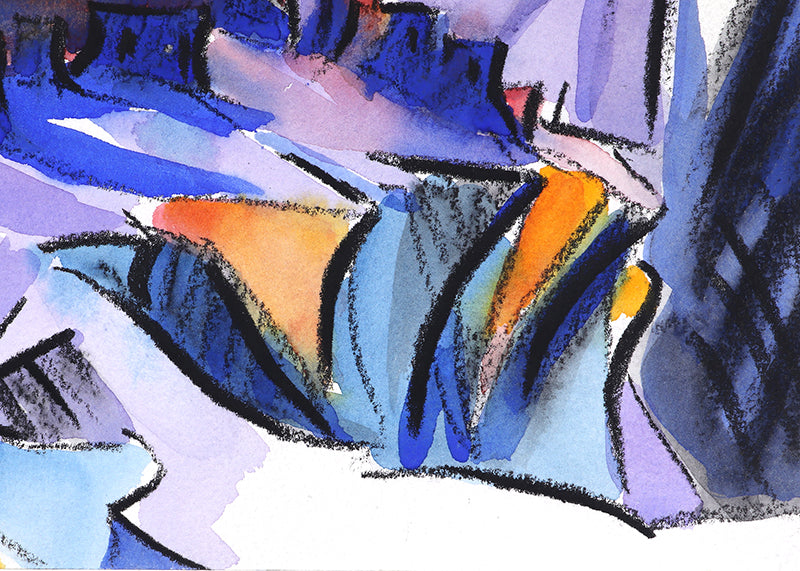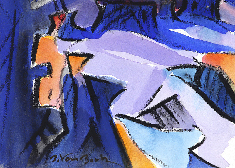 "Walpi #5", original mixed media painting by artist Bert Van Bork. Abstracted landscape of a Hopi village atop a mesa in shades of blue, violet, and gold. Watercolor, ink, and charcoal on paper. Signed by the artist, lower left; Signed, titled, and dated, 2002, on reverse. Presented in an archival mat, outer dimensions measure 14 ¼ x 11 inches.