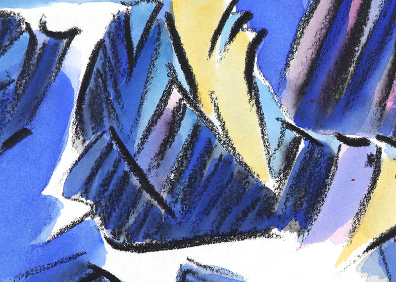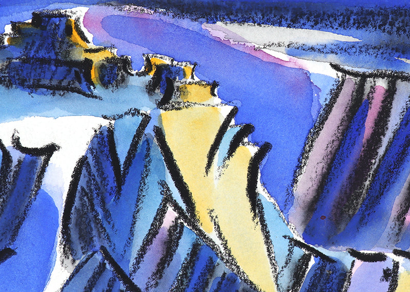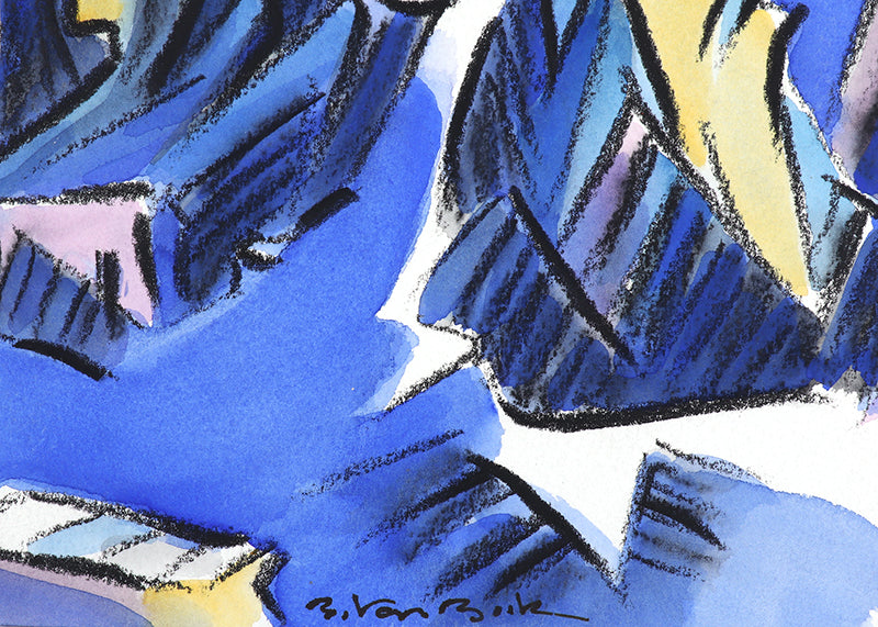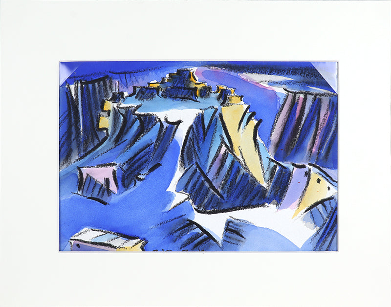 "Walpi #7", original mixed media painting by artist Bert Van Bork. Abstracted landscape of a Southwestern Hopi village atop a mesa. Watercolor, ink, and charcoal on paper. Signed by the artist, lower middle; Signed, titled, and dated, 2002, on reverse. Presented in an archival mat, outer dimensions measure 14 ¼ x 11 inches.