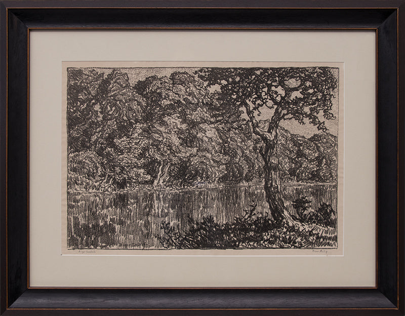 River Motif, original vintage circa 1918 fine art print by celebrated Colorado artist Birger Sandzen (1871-1954). Rendered in an impressionist style, the composition depicts a river surrounded by lush forest. Lithograph on paper. Signed by the artist, lower left. Printed in an edition of only 50 prints Presented in a custom frame with an archival matte & UV70 protectant glass.