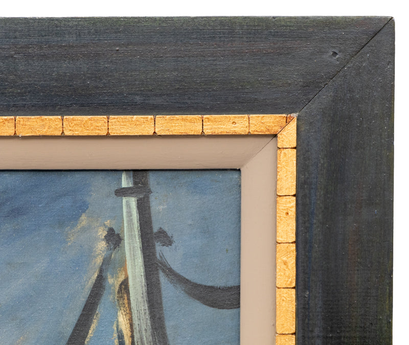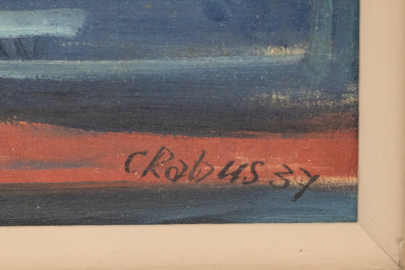 Brussels, Belgium, original vintage painting by artist Carl Rabus. The composition depicts a harbor scene with several boats and the architecture of Brussels, Belgium in the background. Acrylic on board. Signed by the artist and dated, 1937, lower right; Signed and titled on reverse. Presented in a custom vintage frame measuring 28.25 x 36.25 x .25 inches, image size is 22.5 x 28.5 inches.