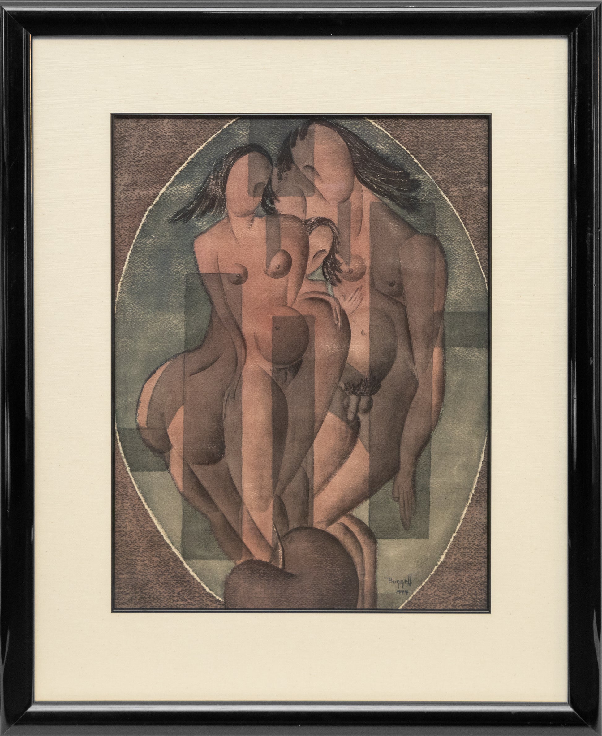 "Adam and Eve and Lilith", original vintage painting by artist Charles Ragland Bunnell. Surrealist in style, the composition depicts three semi abstract figures from Christian and Jewish texts: Adam, Eve, and Lilith. Signed by the artist and dated, 1944, lower right; Signed and titled on reverse. Presented in a custom frame.