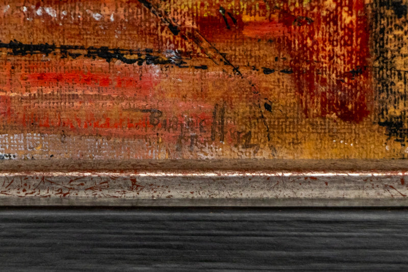 1950s abstract expressionist painting titled Moonrise Over Colorado Springs, by Charles Ragland Bunnell. Oil painting on canvas board. Signed by the artist and dated, 1952, lower center. Presented in a custom black frame.