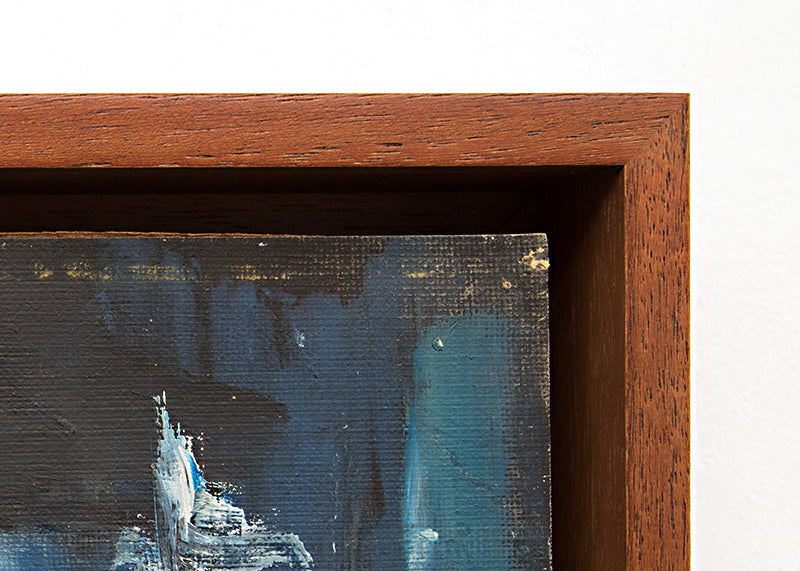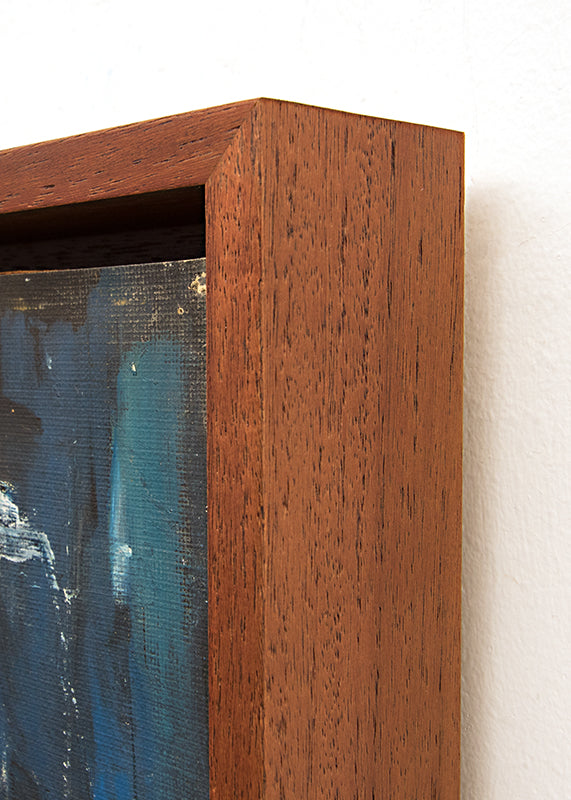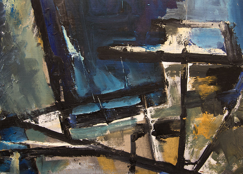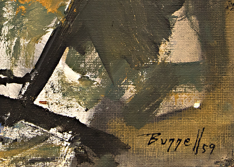 Original vintage painting by Colorado artist Charles Ragland Bunnell. Abstract composition in colors of black, blue, gold, white, gray, and cream. Oil on canvas board. Signed by the artist and dated, 1959, lower right. Presented in a custom hardwood frame.