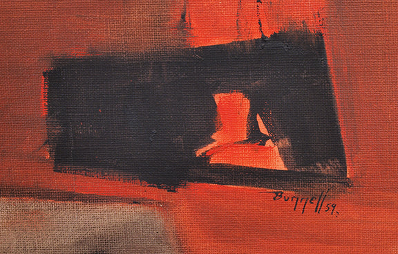 Original vintage 1950s midcentury modern painting by artist Charles Ragland Bunnell. Abstract expressionist composition in colors of orange, black, and grey. Oil on canvas. Signed by the artist and dated 1959, lower right. Unframed, custom framing options available.