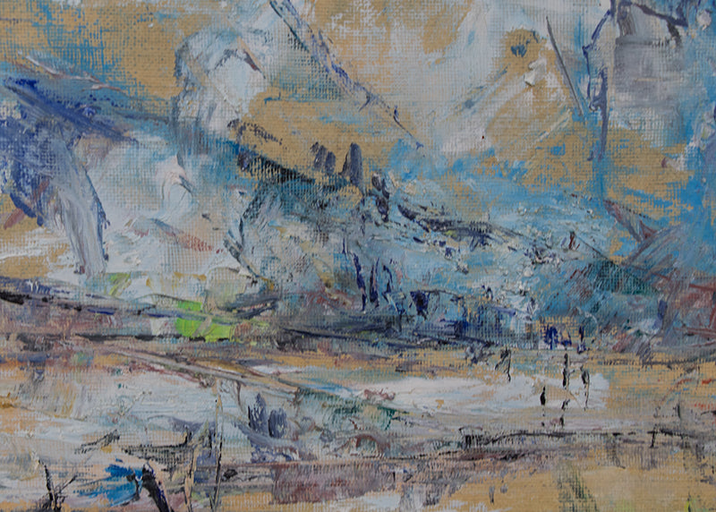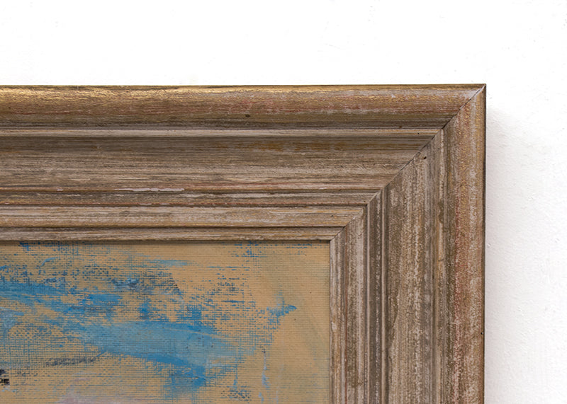 Original vintage mid 20th century painting by artist Charles Ragland Bunnell. The composition depicts an abstracted mountain landscape near Colorado Springs, Colorado. Oil on masonite. Signed by the artist and dated, 1962, lower right. Presented in a custom vintage frame.