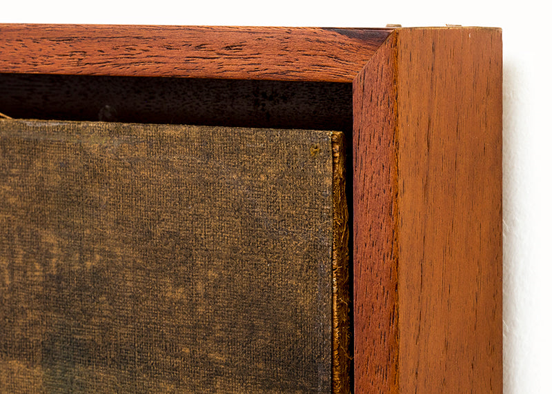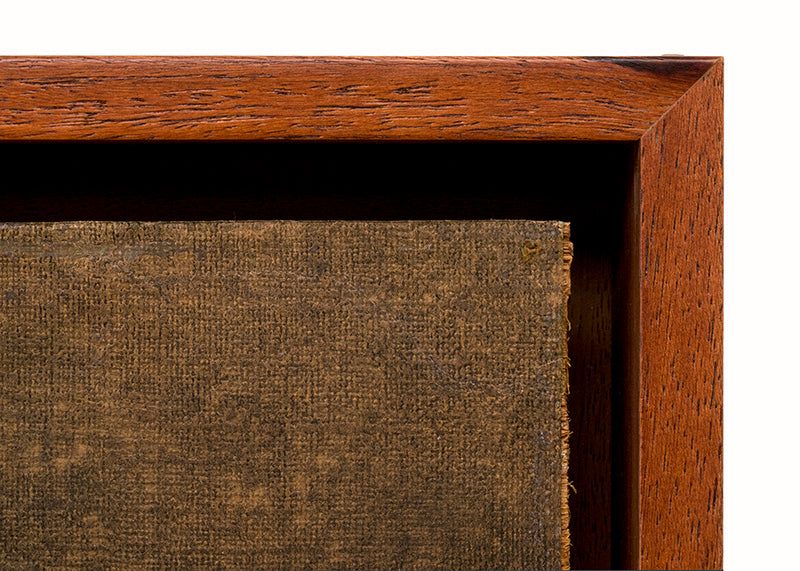Original vintage mid 20th century painting by Colorado artist Charles Ragland Bunnell. Abstract geometric composition in colors of brown, gold, orange, teal, and blue. Oil on paper on board. Signed by the artist and dated, 1955, lower right. Presented in a custom hard wood frame.