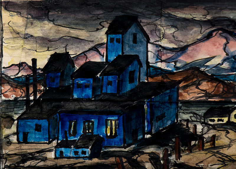 In the 1930s Bunnell used the oil, watercolor and lithography media to create a mini-genre of Colorado's old mining towns and mills, subject matter spurned by many local artists at the time in favor of grand mountain scenery. In contrast to his earlier images, these newer ones - both daytime and nocturnal -- such as Blue Bird Mine essentially are form studies. The conical, square and rectangular shapes of the buildings and other structures are placed in the stark, undulating terrain of the mountains and valleys devoid of any vegetation or human presence. In the mid-1930s he also used the same approach in his monochromatic lithographs titled Evolution, Late Evening, K.C. (Kansas City) and The Mill, continuing it into the next decade with his oil painting, Pikes Peak (1942).
