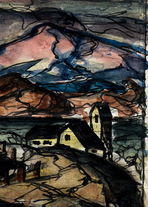 Original vintage painting by artist Charles Ragland Bunnell (1897-1968) from 1940. Stormy landscape of Cripple Creek or Victor, both historic mining towns in Colorado. Watercolor on paper. Signed by the artist and dated, 1940, lower right. Presented in a custom gold frame.