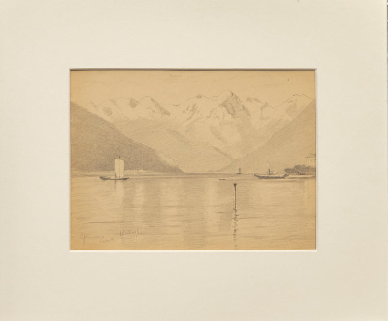 "Afternoon, Como", original vintage drawing by Colorado artist Charles Partridge Adams. Landscape featuring sailboats on Lake Como, Italy, with the Alps rising in the background. Graphite on paper. Titled and dated, 1914, lower left. Unframed, custom framing options available.