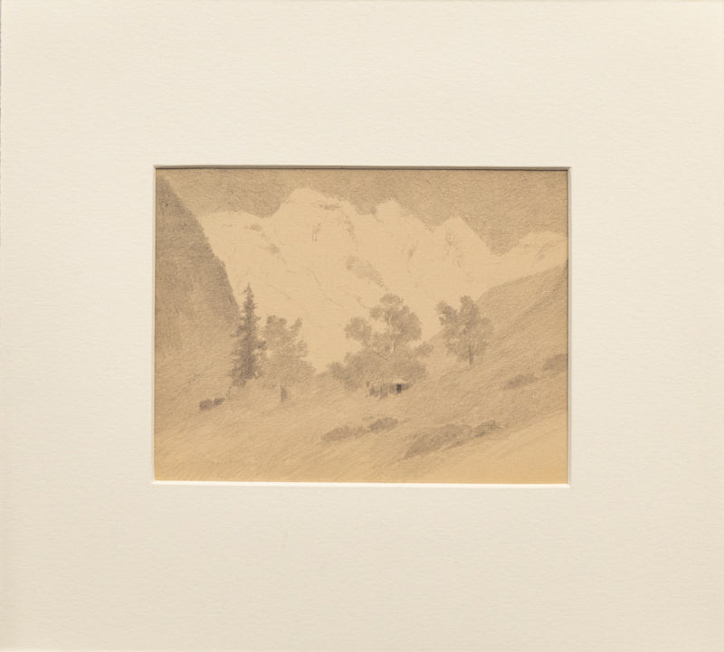 "Sunset - Reflected Light", original circa 1910 drawing by Colorado artist Charles Partridge Adams. Landscape depicting a cabin on a hillside, with mountain peaks in the distance. Graphite on paper. Titled on reverse. Includes a letter of authenticity. Unframed, custom framing options available.
