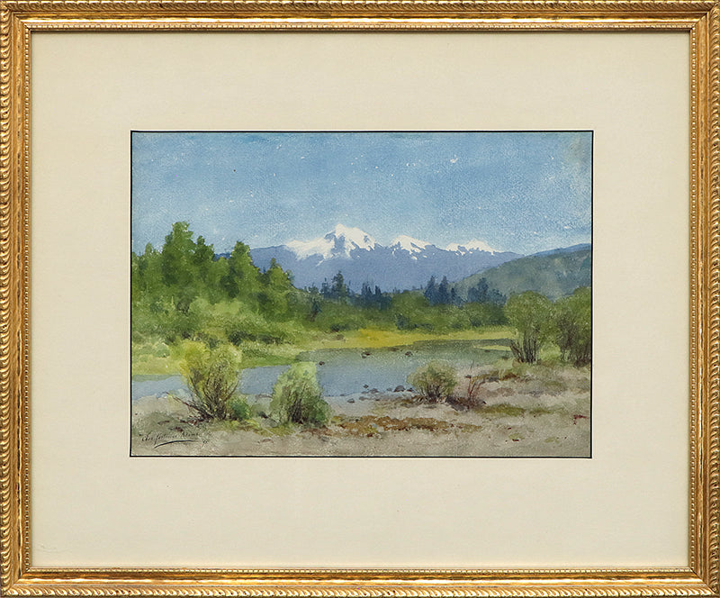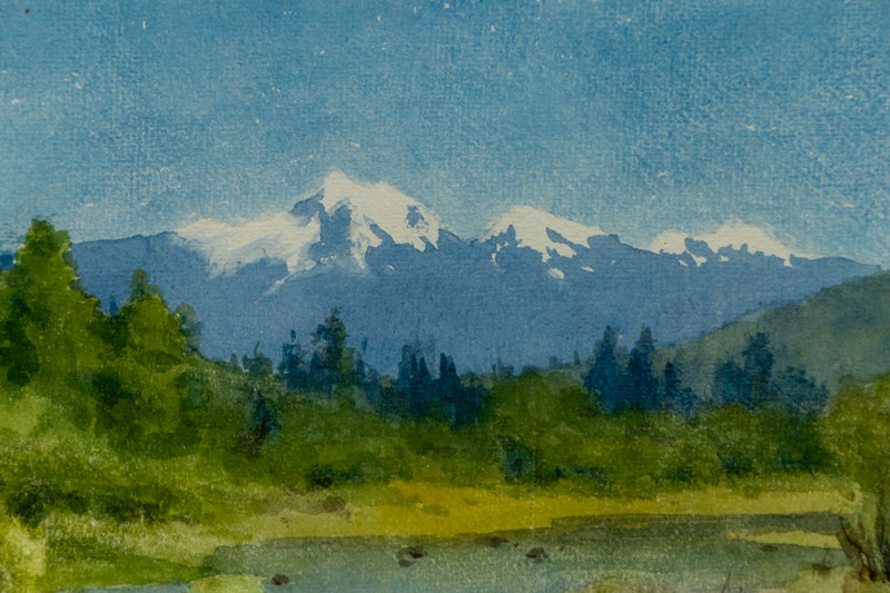 Vintage late 19th century original watercolor painting of a Colorado mountain landscape featuring a river and trees, with snow covered mountain peaks in the distance. Signed by the artist and dated, 1895, lower left. Presented in a custom frame.