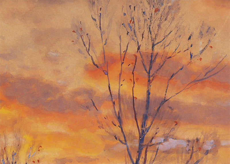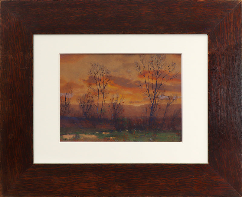 Original circa 1900 painting by Denver artist Charles Partridge Adams. Landscape depicting a vivid orange sunset along the front range in Colorado. Watercolor on paper. Signed by the artist, lower left. Presented in a custom frame with an 8 ply archival mat and anti-reflective UV70 protectant glass.