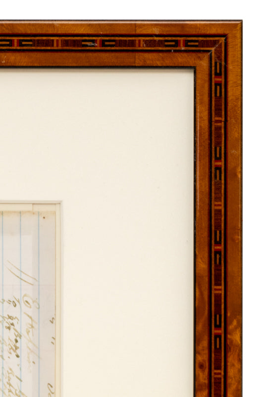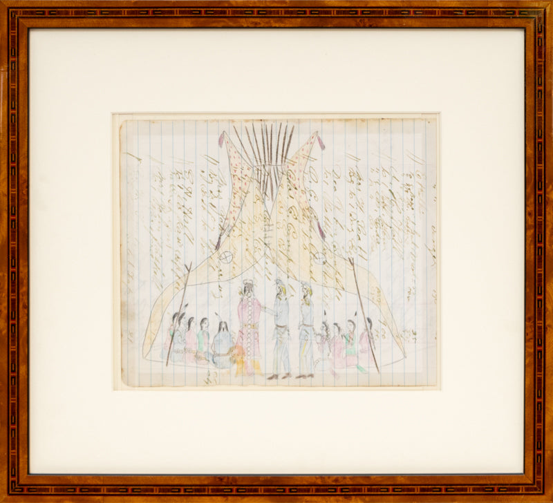 Ledger art produced by an unknown modern artist circa 1970-1999, rendered in the traditional style. The composition depicts a large gathering inside a teepee. Although most figures are seated, three are rendered standing, including two United States Union soldiers. Colored pencil on historic ledger paper. Presented in a new poplar burl wood frame with a 4-ply archival mat and UV 70 protectant glass.