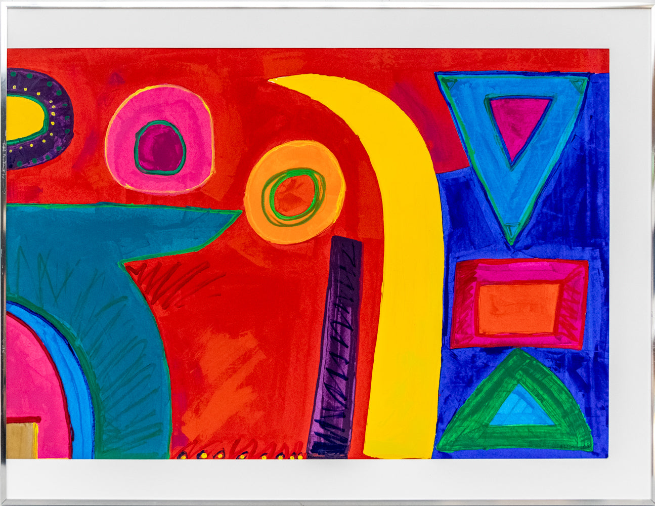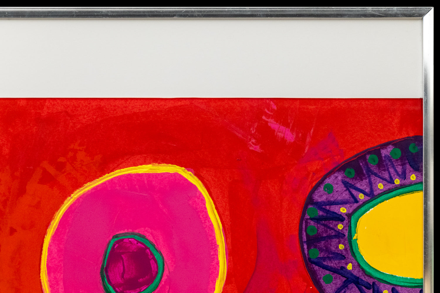 Original painting by Daniel Gelakoska. Abstract diptych in bold colors of red, pink, orange, yellow, green, blue, and violet. Acrylic on paper. Signed and dated, 1998, lower right. Presented in two custom frames with archival mats.
