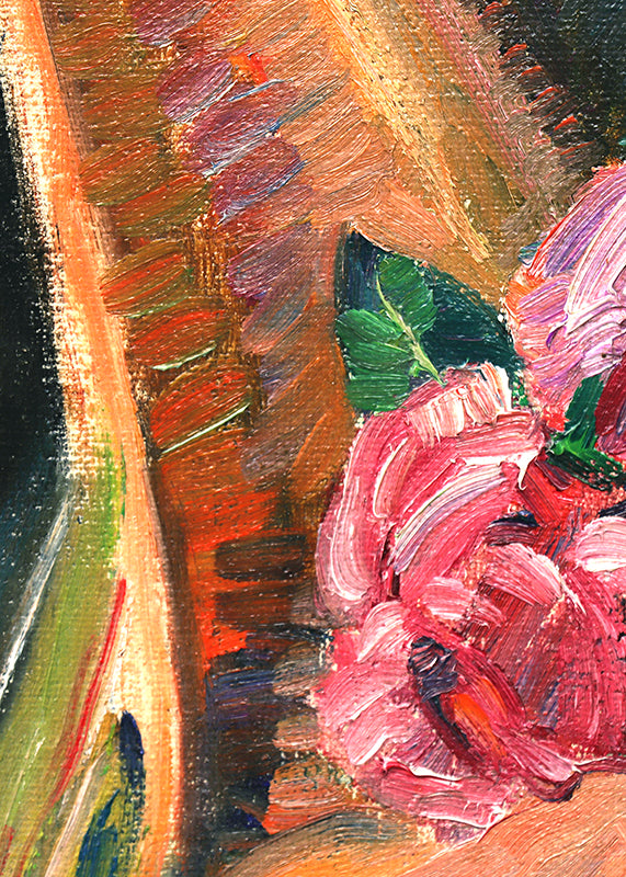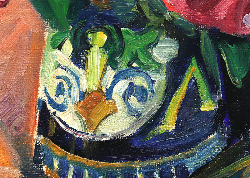 Untitled (Still Life with Pink Roses), original vintage painting by David Spivak (1893-1932). Still life composition featuring pink roses arranged in a vase. Oil on canvas. Signed by the artist, lower left. Presented in a custom frame.