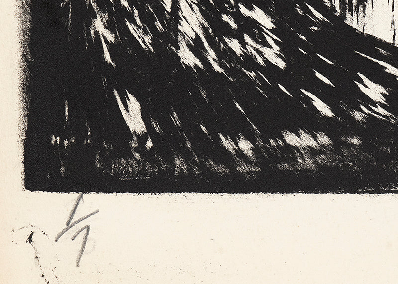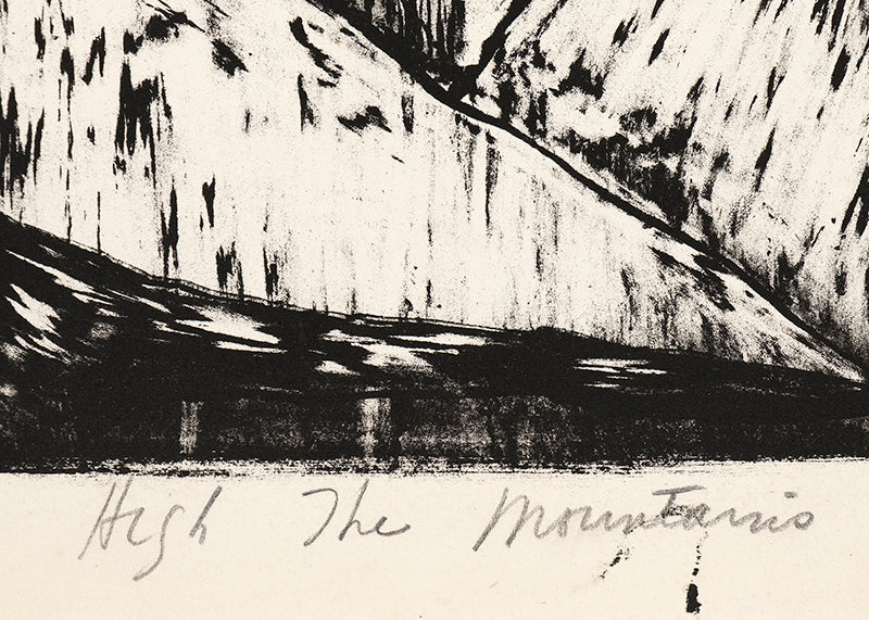 High in the Mountains, original vintage mid 20th century fine art print by Denver artist Edward Marecak. The black and white composition depicts a series of abstracted mountain peaks. Lithograph on paper. Signed by the artist, lower right; Titled lower center. Unframed, custom framing options available.