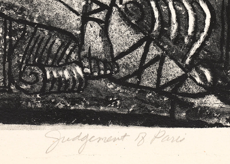 Judgement of Paris, original vintage mid 20th century fine art print by Denver artist Edward Marecak. The composition depicts the ancient Greek goddesses Athena, Hera, and Aphrodite as they await the Trojan youth Paris' decision on who among them is the fairest. Lithograph on paper. Signed by the artist, lower right; Titled lower center. Unframed, custom framing options available.