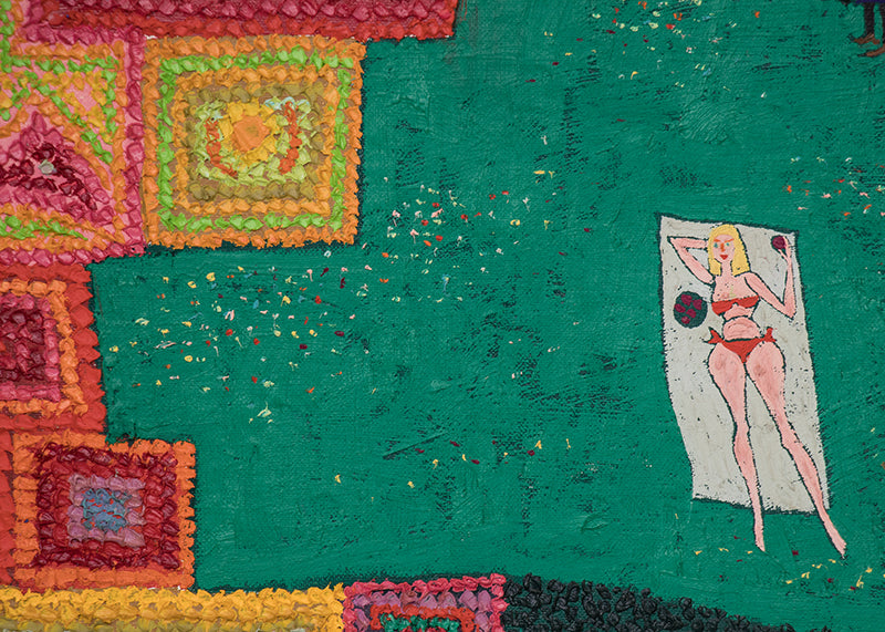 "Persephone Eats of the Forbidden Fruit", original vintage painting by Denver artist Edward Marecak. The semi abstract composition depicts three women sitting on a bench, a woman tanning herself in a bikini, a man lying on a towel, and a woman in an orchard nearby. Oil on board. Estate stamped, titled, and dated, 1980, on reverse. Unframed, custom framing options available.