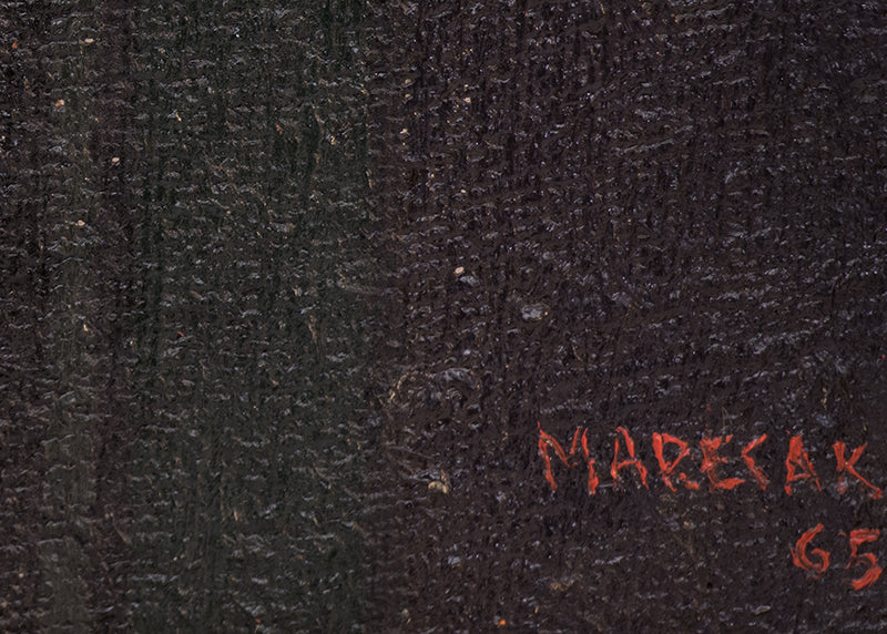 Prior to coming to Colorado, Marecak did watercolors resembling those of Winslow Homer, John Singer Sargent and Charles Burchfield. However, once in Colorado Springs he decided to destroy much of his earlier ouevre, embarking on a totally new direction unlike anything he had previously done. Initially, in the 1940s he was influenced by surrealist imagery and Paul Klee, and in the West by Indian petroglyphs and Kachinas. His first one-person show at the Garrett Gallery in Colorado Springs in 1949 featured paintings and lithographs rendered in the style of Surrealism, Magic Realism & Fantasy and referential abstraction. The pieces, including an oil Witch with Pink Dish, foreshadowed the output of his entire Colorado-based career, distinguished by a dramatic use of color, intricacy of execution and attention to detail contributing to their visual impact. He once observed, "Each time I start a new painting I always fool myself by saying this time keep it simple and not get entangled with such complex patterns, color and design; but I always find myself getting more involved with richness, color and subject matter."