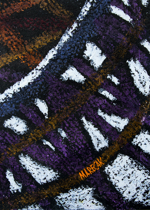 Prior to coming to Colorado, Marecak did watercolors resembling those of Winslow Homer, John Singer Sargent and Charles Burchfield. However, once in Colorado Springs he decided to destroy much of his earlier ouevre, embarking on a totally new direction unlike anything he had previously done. Initially, in the 1940s he was influenced by surrealist imagery and Paul Klee, and in the West by Indian petroglyphs and Kachinas. His first one-person show at the Garrett Gallery in Colorado Springs in 1949 featured paintings and lithographs rendered in the style of Surrealism, Magic Realism & Fantasy and referential abstraction. The pieces, including an oil Witch with Pink Dish, foreshadowed the output of his entire Colorado-based career, distinguished by a dramatic use of color, intricacy of execution and attention to detail contributing to their visual impact. He once observed, "Each time I start a new painting I always fool myself by saying this time keep it simple and not get entangled with such complex patterns, color and design; but I always find myself getting more involved with richness, color and subject matter."