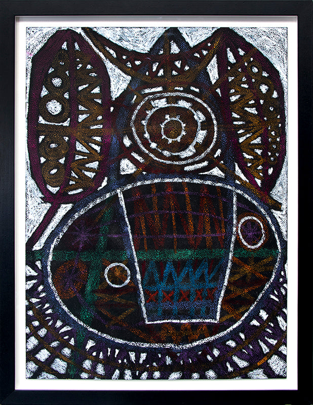 Still Life and Round Lace Table original circa 1960s mixed media painting by Denver artist Edward Marecak. Abstract composition in colors of black, umber, violet, blue, and white. Acrylic and pastel on paper. Signed by the artist, lower right. Presented in a custom frame with archival materials.