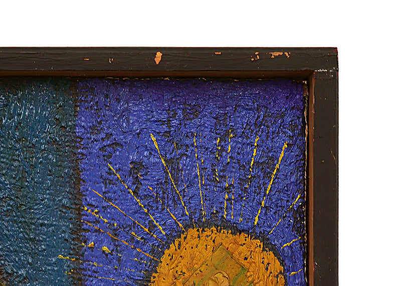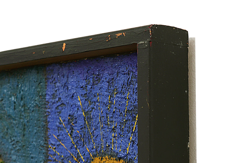 "The Enchantress", original vintage mid 20th century painting by Denver artist Edward Marecak. The semi-abstract composition features a female figure surrounded by autumnal trees and foliage. Oil painting on burlap. Signed by the artist and dated, 1966, lower right; Titled on reverse. Presented in a custom vintage frame.