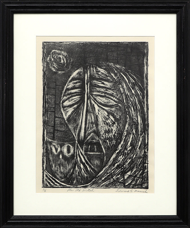 The Old Witch, original lithograph by Denver artist Edward Marecak. Abstracted portrait of an old woman. Lithograph on paper. Signed by the artist, lower right margin; Titled lower center margin; Numbered lower left margin. Presented in a custom frame.